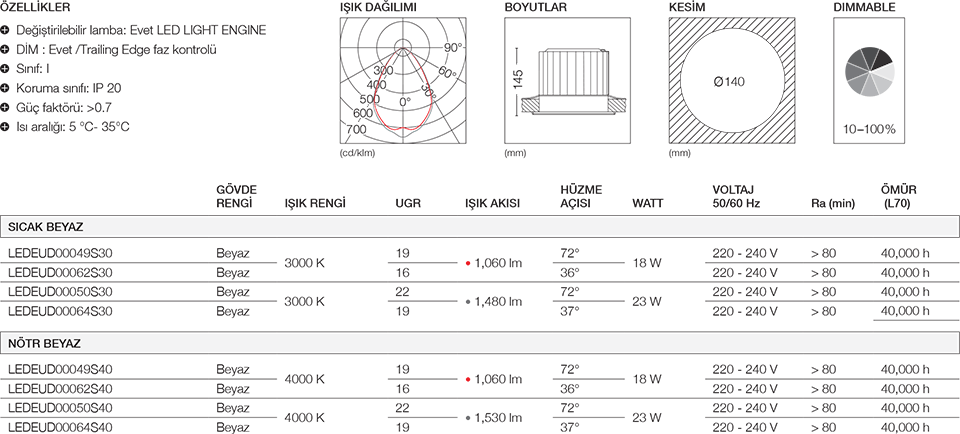 Eşit dağılımlı ışık seviyesi, perakende sektörü için tasarlanan bu yüksek performanslı ürünlere uygun bir iş tanımı. Basit, minimalist görünümleri ve gömme özelliği ile tasarım konseptinize mükemmel uyum sağlıyor. Değiştirilebilir Toshiba LIGHT ENGINE sayesinde nerede kullanılırsa kullanılsın uzun dönemde sürdürülebilir bir yatırım haline geliyor.