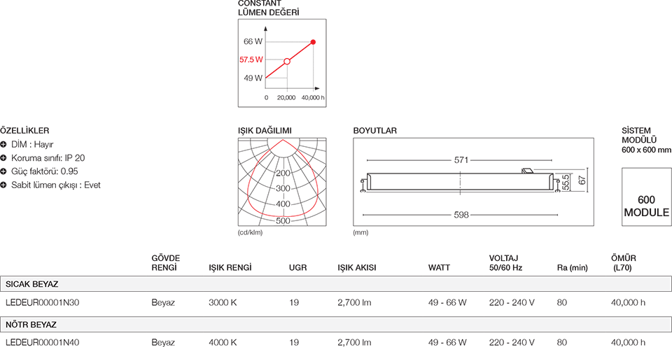 2,700 lm ve 57.5 W ortalama güç tüketimine sahip bu standart asma tavan ışığı, genel ofis ve satış alanları için eşit dağılımlı bir genel aydınlatma sunuyor. Düşük parıltı ve 19 UGR değeri özellikleri ile geleneksel floresan lambaların kullanıldığı tüm alanlarda kullanılabiliyor. Sabit ışık değeri kontrolü özelliği ile tüm işletim süresince sabit düzeyde parlaklık sağlayarak tamamen yeni bir ışık kalitesi sunuyor. Böylece çağdaş çalışma koşulları yaratıyor.